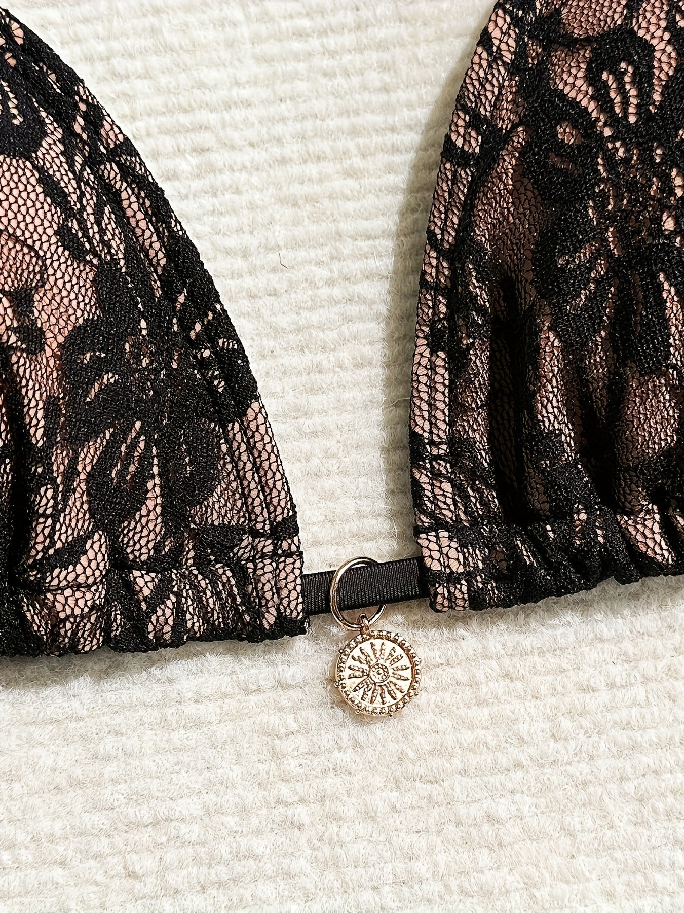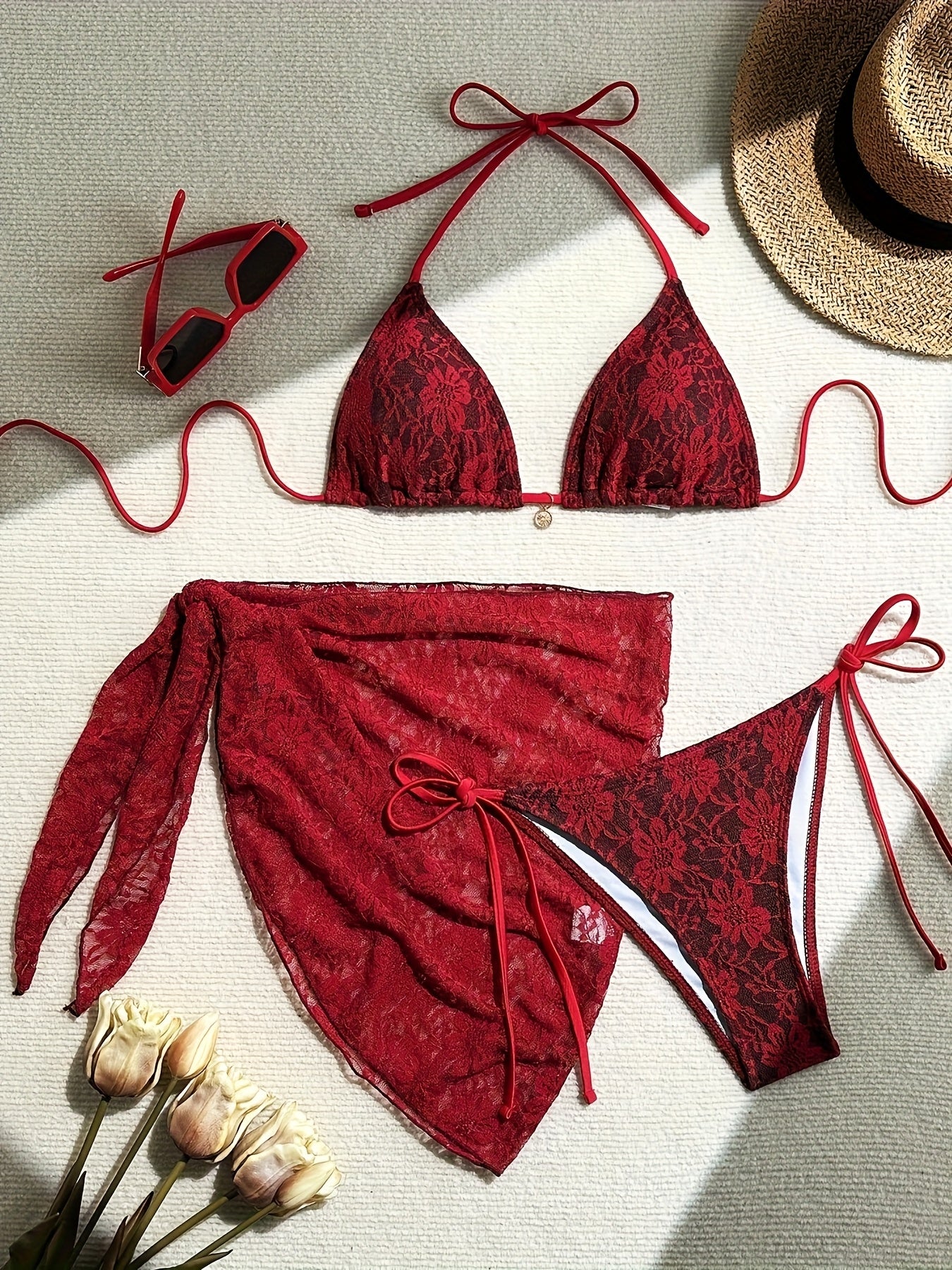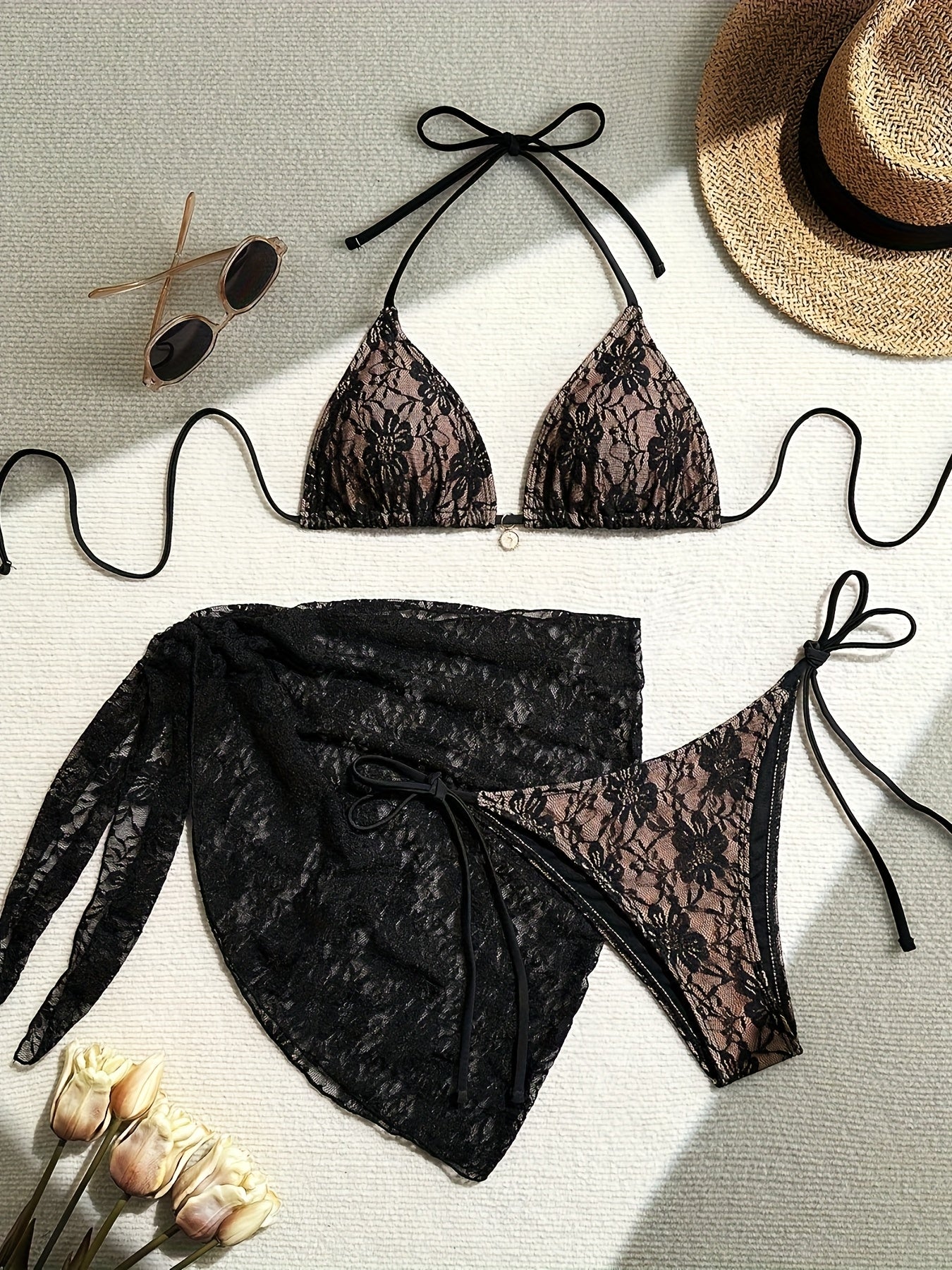 Sexy and exquisite perspective contrast lace halter patchwork three-piece swimsuit with removable padding