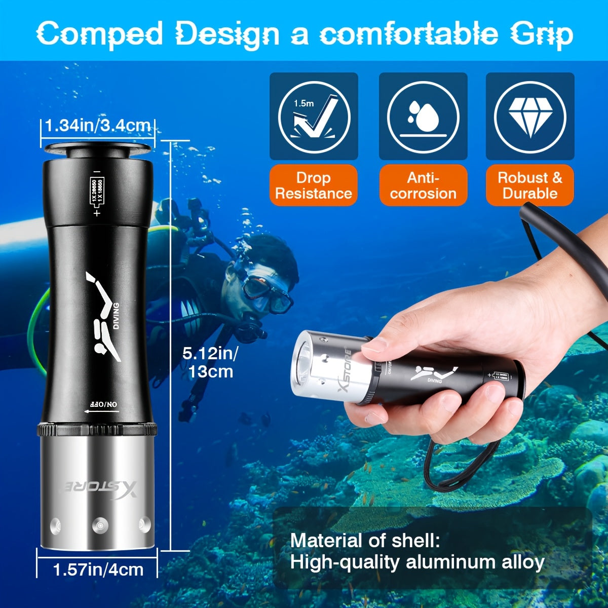 Torcia subacquea a LED L2 ad alta luminosità, con caricabatterie e batteria 18650, 3 modalità, per snorkeling subacqueo a 60 m/196 piedi, immersioni in grotta