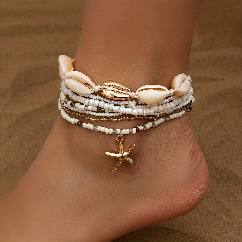 Set di 6 cavigliere con ciondolo a forma di stella marina e perline a forma di conchiglia, set di bracciali alla caviglia impilabili