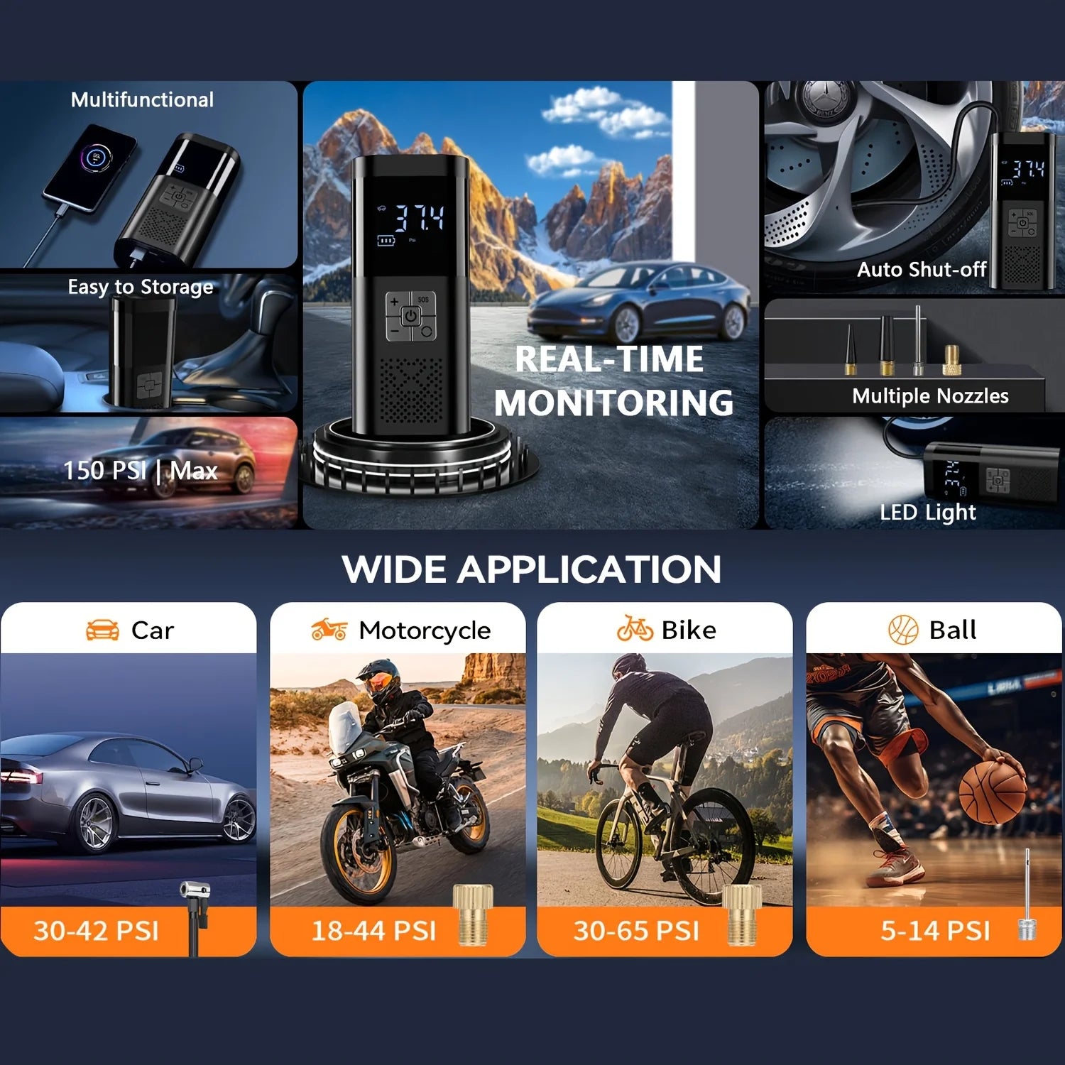 Compressore d'aria portatile per auto, 3 volte piΓΉ veloce, pompa per gonfiaggio pneumatici senza fili da 150 PSI con manometro digitale per auto, moto e bici.