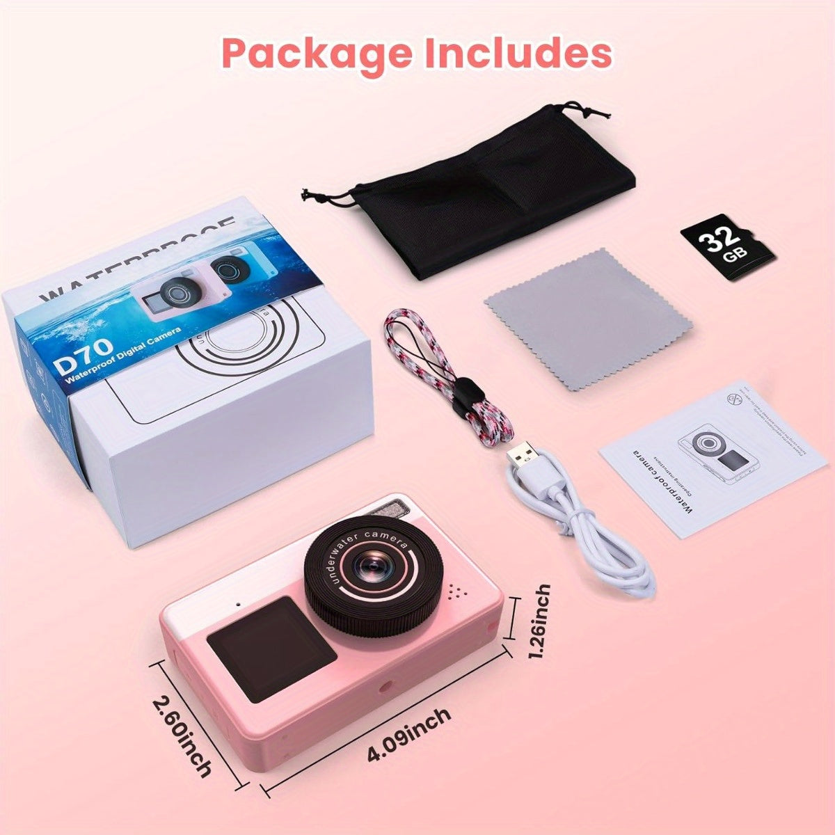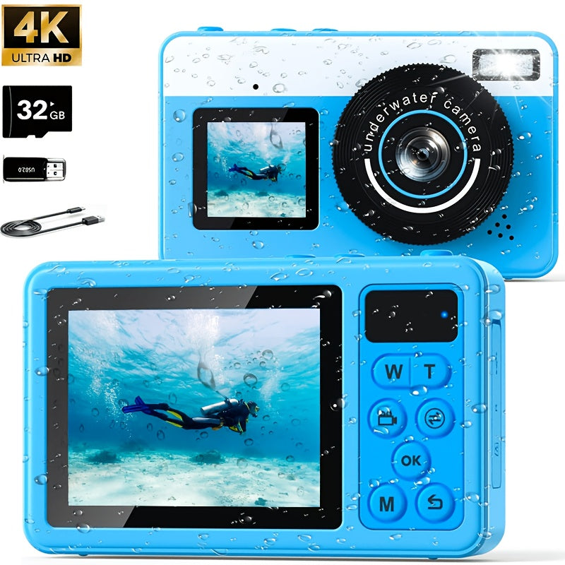 Fotocamera digitale subacquea, fotocamera di alta qualità, fotocamera galleggiante da 10 piedi per snorkeling, surf, nuoto e kayak, selfie a doppio schermo, messa a fuoco automatica, zoom 18x, luce di riempimento, scheda da 32 GB, ricaricabile di tipo C